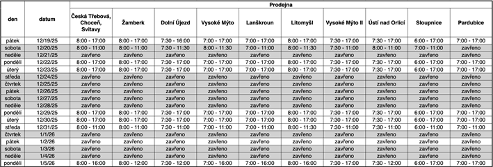 Mezi svátky budou naše prodejny otevřeny podle speciální sváteční otevírací doby. V galerii článku naleznete přehled otevíracích hodin všech našich 13. prodejen.